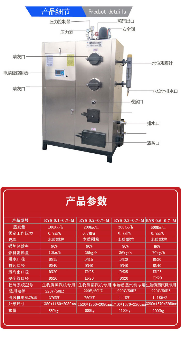 無需報批,無需年檢,可自行安裝。 設備介紹: 生物質蒸汽發生器采用新型的環保燃料生物質顆粒,設備采用半汽化燃燒方式,設置多重保護裝置,品質保障。燃料為生物質顆粒,是電鍋爐成本的四分之一,是燃氣鍋爐成本的二分之一。 一鍵啟動,全自動控制,無需人工操作。無煙塵、零排放、熱效率高。